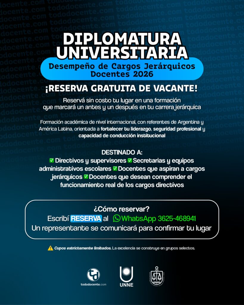 La nueva plataforma educativa para ProfesionalesDIPLOMATURA UNIVERSITARIA en Desempeño de Cargos Jerárquicos Docentes – 2026Esto no es una inscripción: Es la reserva GRATUITA de tu butaca en una formación que va a marcar un antes y un después en tu carrera jerárquicaUna experiencia académica de nivel mundial, con referentes y disertantes de Argentina y América Latina, diseñada para transformar tu liderazgo, tu seguridad profesional y tu capacidad de conducción institucional ¿Quiénes pueden estar interesados? Personal de dirección Personal de supervisión Secretarias y equipos administrativos escolares Docentes que aspiran a ocupar cargos jerárquicos Docentes que desean comprender, dominar y anticipar el funcionamiento real de los cargos directivos y de supervisión.Cupos estrictamente limitados. La excelencia se construye en grupos selectos. No te quedes afuera. Reservar Ciclo de charlas para Docentes de todo el PaísMartes 04 Noviembre del 2025 a las 20:00Aprobado por Resolución 327/25 CD Evento: Martes 04 Noviembre del 2.025. Hora: 20:00. Modalidad: Virtual en vivo en HD y asincrónica por aula. Organiza y certifica: Facultad de Derecho, Ciencias Sociales y Políticas de la Universidad Nacional del Nordeste (UNNE). Usuarios con MEMBRESIA 2025 (Gratis) COMPRAR Comprar Membresia tododocente.com 2026 Membresias Precio $ 60.000,00 Valorado con 0 de 5 Comprar La Biblioteca de tododocente.com Sin categorizar Precio $ 50.000,00 Valorado con 0 de 5