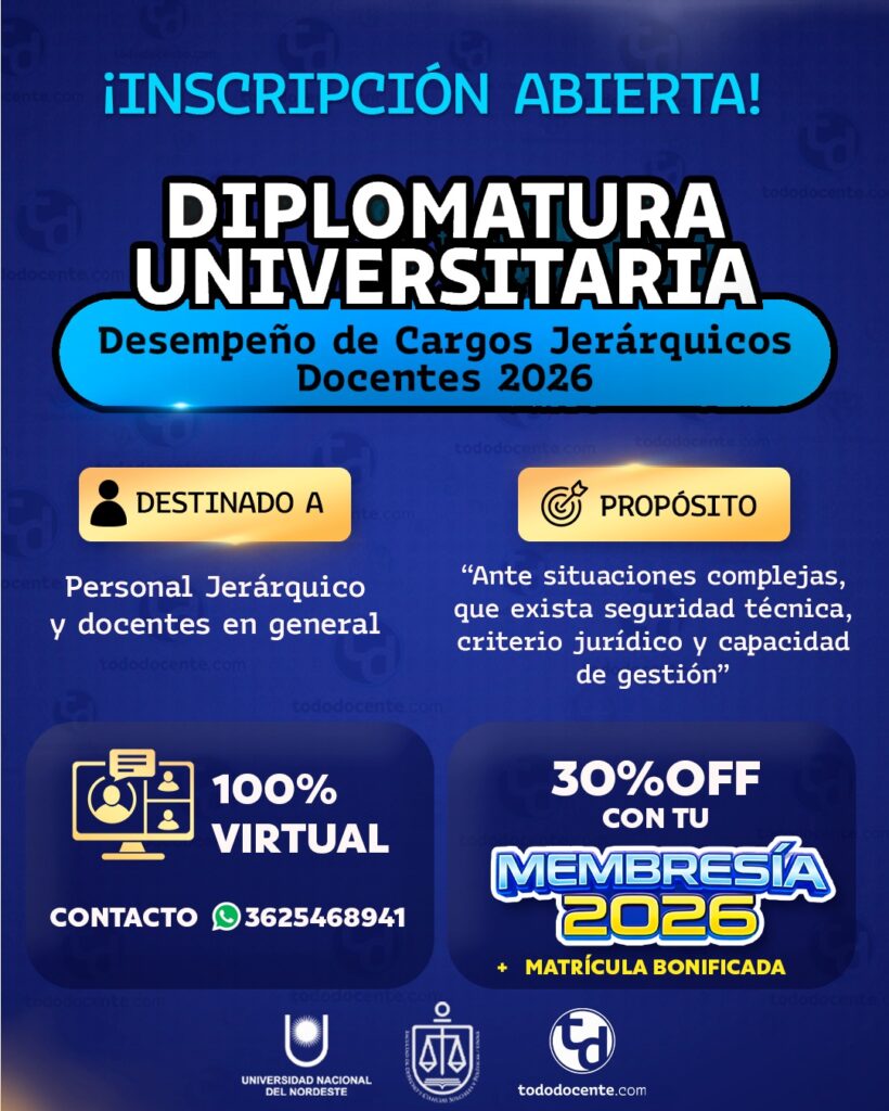 La nueva plataforma educativa para ProfesionalesDIPLOMATURA UNIVERSITARIA en Desempeño de Cargos Jerárquicos Docentes – 2026Una experiencia académica de nivel mundial, con referentes y disertantes de Argentina y América Latina, diseñada para transformar tu liderazgo, tu seguridad profesional y tu capacidad de conducción institucional ¿Quiénes pueden estar interesados? Personal de dirección Personal de supervisión Secretarias y equipos administrativos escolares Docentes que aspiran a ocupar cargos jerárquicos Docentes que desean comprender, dominar y anticipar el funcionamiento real de los cargos directivos y de supervisión.Cupos estrictamente limitados. La excelencia se construye en grupos selectos. No te quedes afuera. Reservar Ciclo de charlas para Docentes de todo el PaísMartes 04 Noviembre del 2025 a las 20:00Aprobado por Resolución 327/25 CD Evento: Martes 04 Noviembre del 2.025. Hora: 20:00. Modalidad: Virtual en vivo en HD y asincrónica por aula. Organiza y certifica: Facultad de Derecho, Ciencias Sociales y Políticas de la Universidad Nacional del Nordeste (UNNE). Usuarios con MEMBRESIA 2025 (Gratis) COMPRAR Comprar Membresia tododocente.com 2026 Membresias Precio $ 60.000,00 Comprar La Biblioteca de tododocente.com Sin categorizar Precio $ 50.000,00